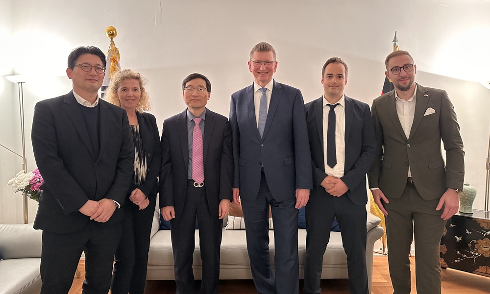 Der Leiter MIN Jaehoon, lud am Dienstag, den 7. Oktober, Vertreter des Innenministeriums des Landes NRW – Peter Mosch, Landeskriminaldirektor; Katja Kruse, Leiterin des Referates für Internationale Polizeiliche Zusammenarbeit; Maik Pohl, Teildezernatsleiter für Automotive IT beim Landesamt für zentrale Polizeiliche Dienste NRW; und Jonas Becker, Researcher beim Dezernat für Softwareentwicklung und Ermittlungsunterstützung beim Landeskriminalamt NRW – in die Residenz ein. Im Mittelpunkt der Gespräche standen die Bewertung der bisherigen Erfolge der koreanisch-deutschen Zusammenarbeit im Bereich Wissenschaft und Innere Sicherheit, Pläne für die Teilnahme an der KPEX und der GPEC sowie Maßnahmen zur Vertiefung polizeilicher R&D-Partnerschaften.